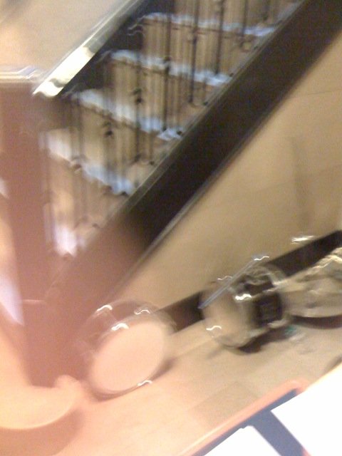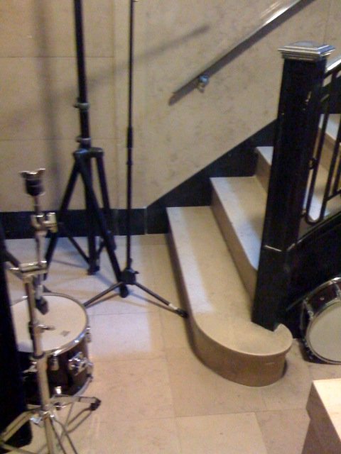 Picture #2 reveals a snare drum and a tom tom drum lying on the floor at the bottom of the stairs within the cited stairwell.